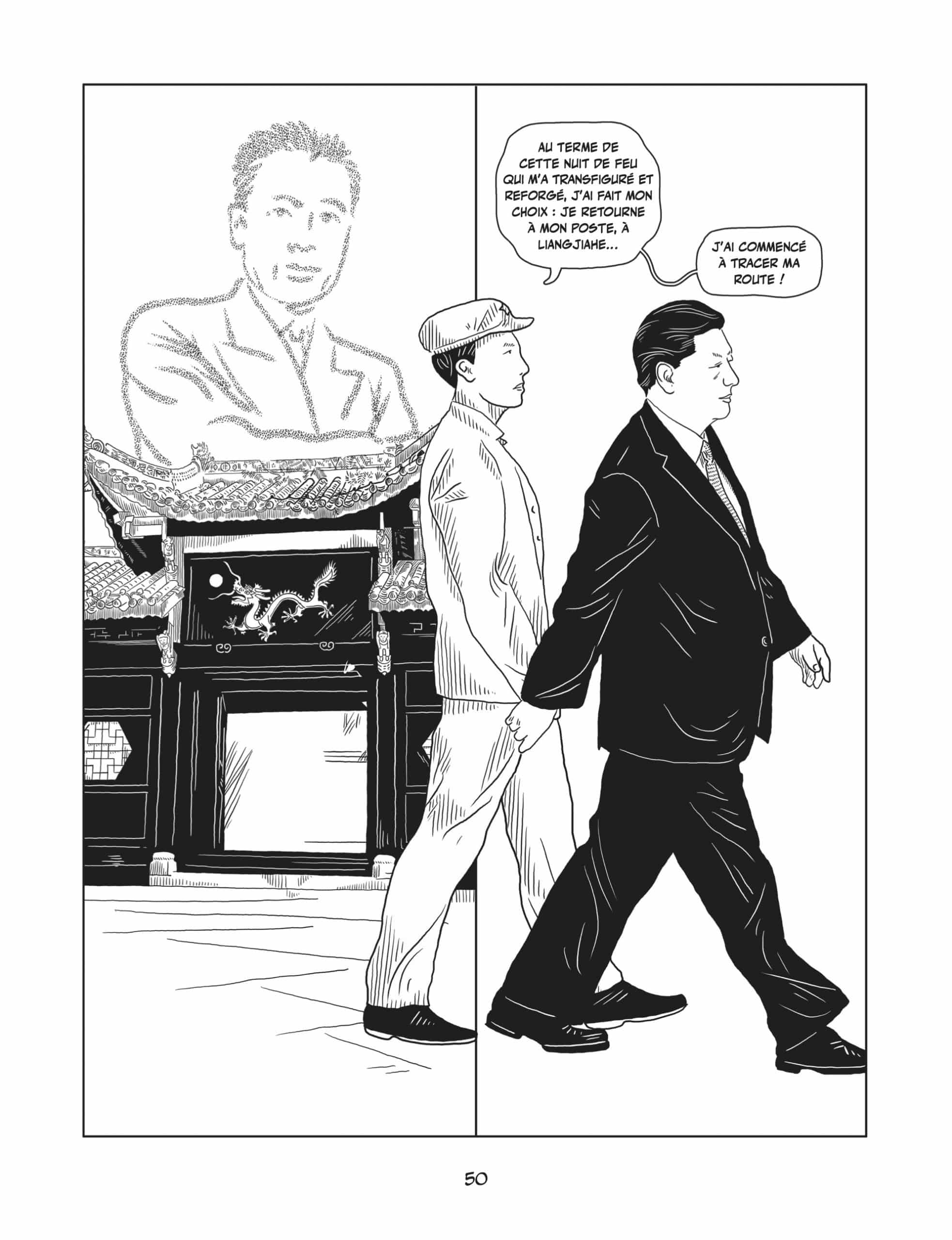 Ce vaste roman graphique retrace la vie et l’ascension de Xi Jinping, de sa naissance le 15 mars 1953 à l’an 2022. Cette vaste enquête cherche à éclairer ses origines, ses appuis et influences, ainsi que les innombrables péripéties émaillant son enfance, son adolescence, et sa carrière jusqu’à ce jour. On y découvre son incroyable parcours, d’une position ultra-privilégiée dans sa petite enfance, à la longue traversée du désert de sa famille et du pays. On pourra suivre étape par étape son parcours du combattant jusqu’au prix suprême, l’accession au pouvoir en 2012, suivie 10 ans plus tard par l’octroi d’un troisième mandat présidentiel – l’équivalent d’un trône d’empereur à vie, à l’instar du seul Mao Zedong durant l’histoire de la Chine socialiste. En filigrane, on découvre donc aussi, dans cette histoire d’un homme, celle de la Chine contemporaine et les choix qui la guident -des choix désormais largement imposés par Xi Jinping.