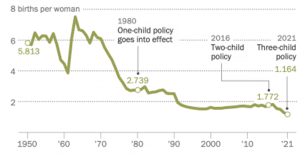 La politique de l’enfant unique a été un double échec paradoxal : non seulement, il n’a pas permis véritablement d’arriver à un enfant par couple, mais il a renforcé des tendances baissières que le gouvernement, 36 ans après, se voit tout autant dans l’impossibilité de renverser avec sa politique du « deux enfants par famille » (puis trois en 2021). L’introduction de la possibilité d’avoir deux enfants est allée de pair avec une accélération de l’effondrement de la fécondité.