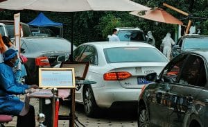 Le jour J, tous les candidats au dépistage sont accueillis dans le grand parking extérieur. Après avoir donné sa température et montré son code QR de santé à des employés en combinaison blanche, il faut faire la queue, le masque sur le visage, tout en prenant bien soin de garder ses distances avec la personne précédente, pour s’enregistrer et collecter son tube à essai sous une tente de fortune.