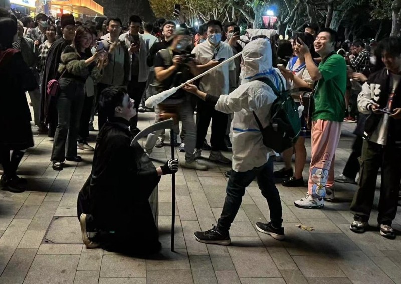 Le 31 octobre, nuit d’Halloween, des images de célébrations costumées venues des rues de Shanghai ont fait le tour des réseaux sociaux chinois. On a découvert que parmi les participants, il y avait non seulement ceux qui se déguisaient en créatures traditionnelles d’Halloween, mais aussi de nombreuses personnes utilisant la créativité et l’humour pour aborder des sujets sensibles, voire tabous, de la société chinoise sous haute pression.