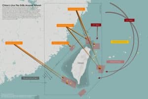 On l’a vu : pour punir le discours prétendument indépendantiste de William Lai qui appelait en fait au dialogue avec la Chine, Pékin a soumis Taïwan à deux jours d’encerclement militaire : plus de 49 avions et 19 avions en cinq points différents autour de l’île (cf carte).