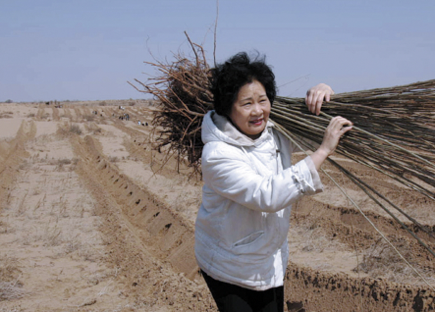 La première fois, elle a découvert l’immensité du désert, le sable qui s’immisce partout jusqu’à recouvrir les draps de sa chambre d’hôtel à la fin de la journée. Tous les jours, il fallait lutter contre le vent et le sable, contre la méfiance des autorités locales devant une citadine qui semblait avoir perdu la tête. Son premier arbre, elle l’a planté dans la bannière de Hure, au sud de la région autonome de Mongolie-Intérieure. Il est arraché par le vent le jour suivant puis enterré sous une tempête de sable. Les mots de son fils répétés comme un mantra, Yi Jiefang a persévéré, faisant fi d’un dos de plus en plus fragile. Las, sa colonne vertébrale finit par se fracturer et les opérations se sont enchaînées, neuf au total sans entamer l’engagement de Yi Jiefang, à l’image des arbres plantés qui poussaient en résistant jour après jour au vent et au sable.