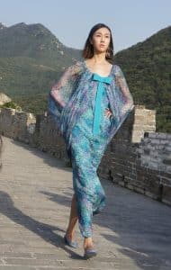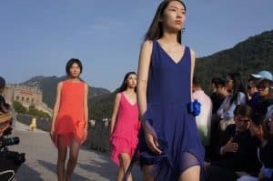 Jeudi 20 septembre, à l’occasion du 40ème anniversaire de la présence de Pierre Cardin en Chine, la maison de couture fêtait l’événement d’une manière exclusive : elle choisissait pour son défilé le site grandiose de la Grande Muraille à 60 km de Pékin, sur la section jouxtant l’hôtel Commune by the Great Wall— c’était pour le groupe, la première fois qu’il présentait sur ce monument un défilé complet !