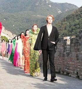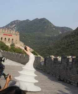 Jeudi 20 septembre, à l’occasion du 40ème anniversaire de la présence de Pierre Cardin en Chine, la maison de couture fêtait l’événement d’une manière exclusive : elle choisissait pour son défilé le site grandiose de la Grande Muraille à 60 km de Pékin, sur la section jouxtant l’hôtel Commune by the Great Wall— c’était pour le groupe, la première fois qu’il présentait sur ce monument un défilé complet !