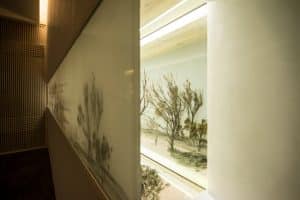 Non loin de là trône un autre « trompe culture » d’une tout autre nature : un dessin très grand format, qui représente un vaste paysage de nuages, d’arbres et de montagnes, dans la plus pure tradition des dessins à l’encre des grands maîtres du passé. Estompes, dégradés, coups de pinceaux comme autant de témoignages des gestes sûrs de celui qui les traça à la surface du papier. Pourtant, ce n’est pas un dessin : pas d’encre, pas de trait, aucune intervention graphique. Le mystère se révèle dès que je passe derrière l’œuvre qui livre un amoncellement de papiers découpés, de bouts de ficelle et de petits morceaux de bois. Tout un bric-à-brac de récupération qui, assemblé de manière précise, projette une image sur la feuille qui est en fait un vaste écran translucide. C’est une source de lumière placée derrière l’œuvre qui, en projetant les ombres de ces rebuts, les transforme de l’autre côté de l’écran en un magnifique paysage subtil et nuancé.