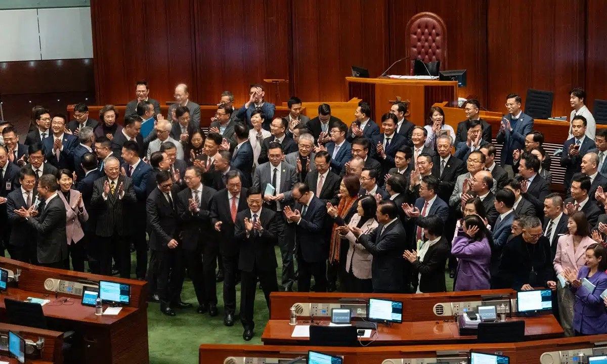 Puis les choses sont allées très vite : le Bureau de la sécurité de Hong Kong a lancé une consultation publique sur la législation relative à l’article 23 le 30 janvier 2024, qui s’est terminée un mois plus tard. Le projet présenté au Conseil législatif le 8 mars 2024 prévoit des peines allant jusqu’à la prison à vie pour trahison, insurrection et incitation à la mutinerie d’un membre des forces armées chinoises. Officiellement adopté le 19 mars (cf photo), il est entré en vigueur quatre jours plus tard…