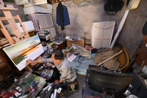 Le devoir accompli, Wei Guangming va alors passer à toute autre chose. Dans les toilettes partagées avec la maison voisine, il commence par une douche (ablutions précaires sous la pomme d’arrosage qui pend de la chasse d’eau), change pour une tenue propre quoique éculée et décolorée par les ans – tout de sa garde-robe a été récupéré dans la rue. Le voilà prêt à son second métier, qui a beaucoup plus que le premier à voir avec une passion : s’installant devant son chevalet, dans son atelier de 20m2, jouxtant sa maison, il peint. Ce matin justement, passant près du rivage de la rivière Pingshui, il s’est arrêté un instant sur la scène d’un pêcheur sur son canot, avec ses cormorans un fil à la patte, plongeant à tour de rôle pour ressortir avec un poisson que le maître lui retirait du bec pour le jeter frémissant au fond de la barque… Ce tableau est vendu d’avance : il ira à la patronne d’une usine de plastique, sa fidèle cliente, qui lui a commandé une œuvre six mois plus tôt au bas mot. Ce qu’elle attendait, en fait, était son portrait sur fond de son usine et de ses grandes cheminées crachant leur fumée. Mais à chaque essai, Guangming, mécontent, abandonnait pour gratter la toile et reprendre quelques jours après, sans jamais réussir. C’est que notre homme est un peintre autodidacte, à la technique naïve et déficiente à ses yeux, faute d’avoir étudié à bonne école.